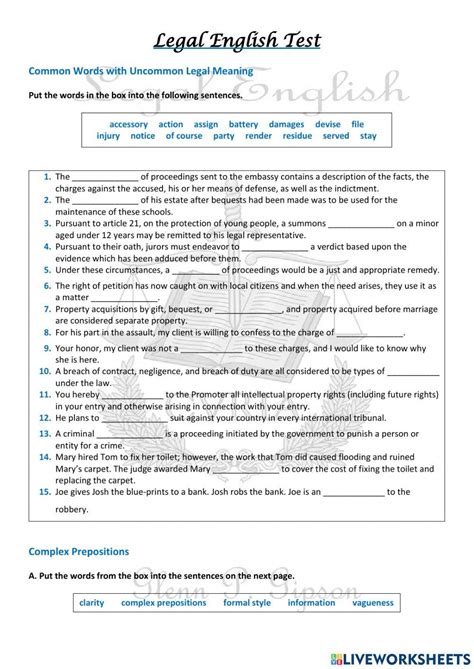 Legal English worksheets can be used in a variety of ways. They can be used as a tool to practice and improve your legal English skills. They can also be used as a reference for those who are just starting to learn legal English. Additionally, they can be used to help prepare for legal exams or to review legal concepts.