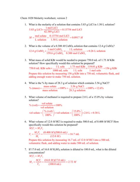 Understanding Molarity Worksheet 1 Answer Key