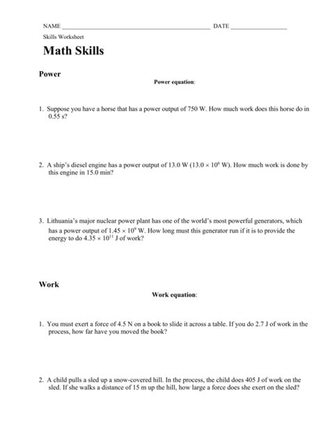 Skills Worksheet Math Skills Work And Energy is an essential tool for any student or teacher in the fields of mathematics. This worksheet is used to teach the principles of math, such as addition, subtraction, multiplication, division, and more. It is also used to build problem-solving skills and to help students understand how certain formulas work. This worksheet is essential for learning the basics of math, and it can be used as an assessment tool for teachers.